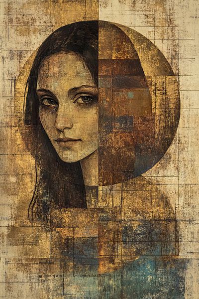 Woman gold and geometry - This is a painting of a modest portrait of a woman with long dark hair, painted in golden brown earth tones and beige, with a large geometric circle and square patchwork texture partially enclosing the face — a modern figurative abstract painting, i.e. a painting of a woman, painting woman.