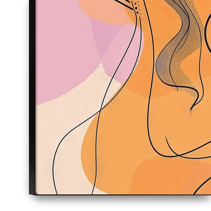 This modern line art portrait of a woman is brought to life with vibrant colour accents in purple, orange and pink. The flowing lines and coloured areas emphasise the expressive facial features and long, flowing hair. Ideal for contemporary living spaces, offices or galleries, this artwork is perfect for lovers of modern and minimalist…