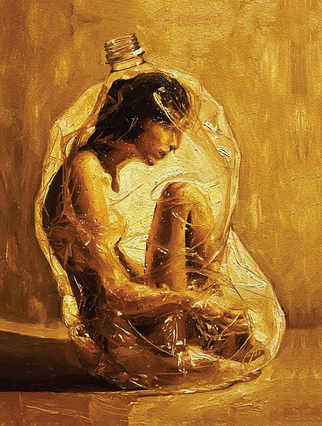 An emotionally powerful oil painting depicting a woman enclosed inside a transparent plastic bottle. This symbolic artwork reflects how excessive cosmetic procedures and synthetic materials reshape the modern female identity. Thick, textured brushstrokes and warm golden tones intensify the feeling of suffocation and transformation,…