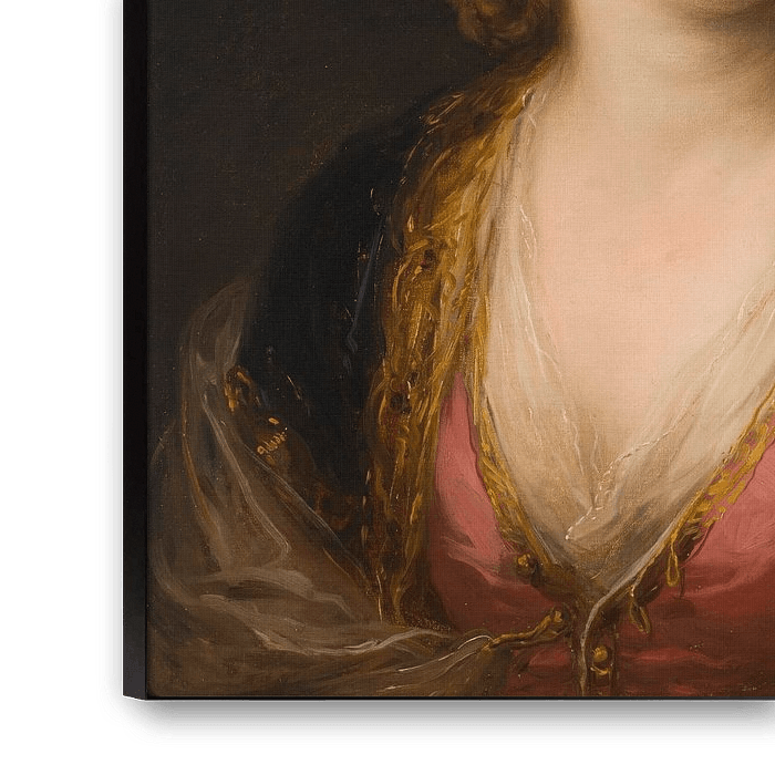 Loose yet assured brushwork, seen in gold edging along the shoulders, animates this painting of an unknown woman wearing Turkish clothing. Foreign attire was popular in London throughout the 18th century, and Angelica Kauffmann painted several versions of garments that were based on clothing worn in the Ottoman Empire. Western Europeans, including the British, appropriated and exoticized Middle Eastern societies, often using stereotypes, an embodiment of a colonial outlook towards non-European cultures. For this portrait, the artist depicted a loose gown trimmed in white lace ("gömlek"), a more fitted long-sleeved salmon-colored garment with buttons down the front ("yelek"), and an outer long coat edged in lace and fashioned from plum-colored velvet ("entari"). Dated on the back of the canvas in what appears to be the artist’s own hand, this painting may have served as an advertisement to convince women in London society to have their portraits painted in Turkish dress.