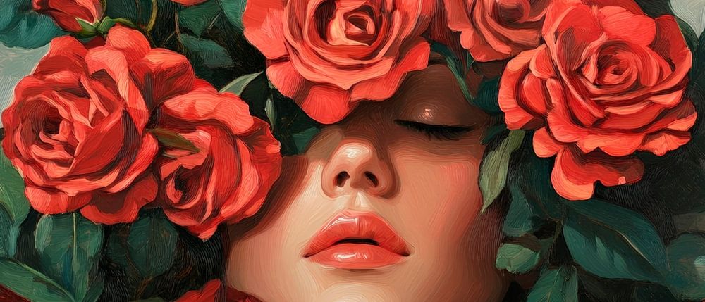 A dreamlike interplay of bright red roses and a gentle, dreamy face attracts everyone's attention. The lush flora frames the image perfectly and conveys a sense of calm and passion. This artwork is ideal for the bedroom to create a romantic and inspiring atmosphere.
