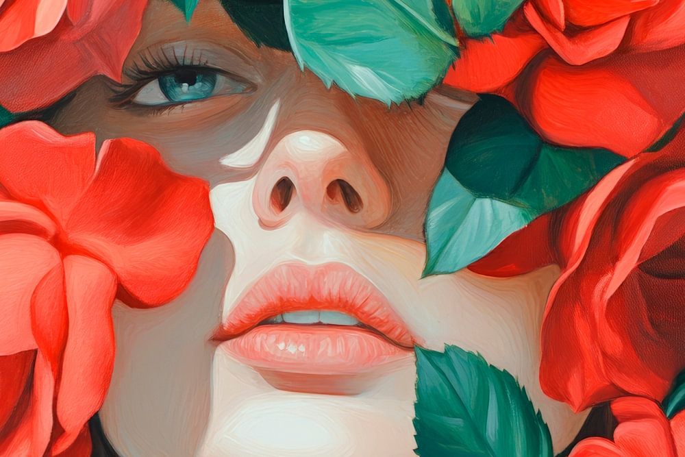 A mesmerising interplay of bright red roses and soft facial features unfolds as if nature itself is offering a secret glimpse. The blooming splendour and subtle elegance add a sense of freshness and romance to any room. Ideal for the bedroom to create a relaxing atmosphere and bring dreams to life.