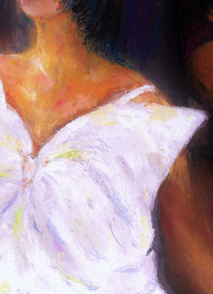 Figurative hand-painted portrait with oil pastel chalk of a woman.