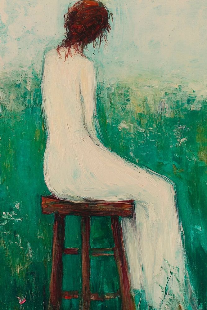 Captured in delicate colour tones, a pensive figure sits in a flowering field, surrounded by soft shades of green, while a bright red triangle breaks through the horizon. This harmonious composition lends the living room a calm, meditative atmosphere and invites you to dream and linger.