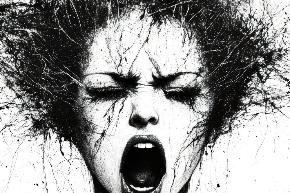 Black and white illustration of a screaming woman with messy hair, expressing intense emotions such as anger, frustration or despair. The ink splatter effect enhances the dramatic effect and emphasises the chaotic mood of the picture.