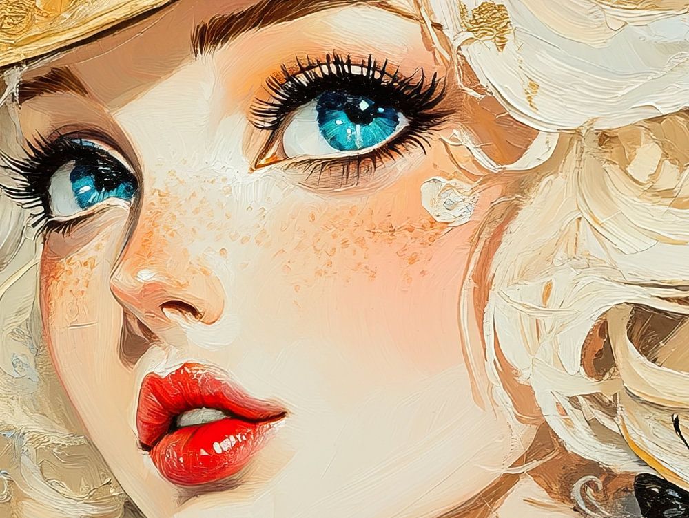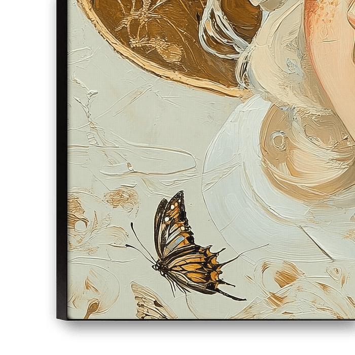 Woman with Big Eyes and Gold Accents - This woman painting shows a young girl with big bright blue eyes and a striking hat, surrounded by a spectacular butterfly and beautiful gold details that create a playful and dreamy atmosphere.