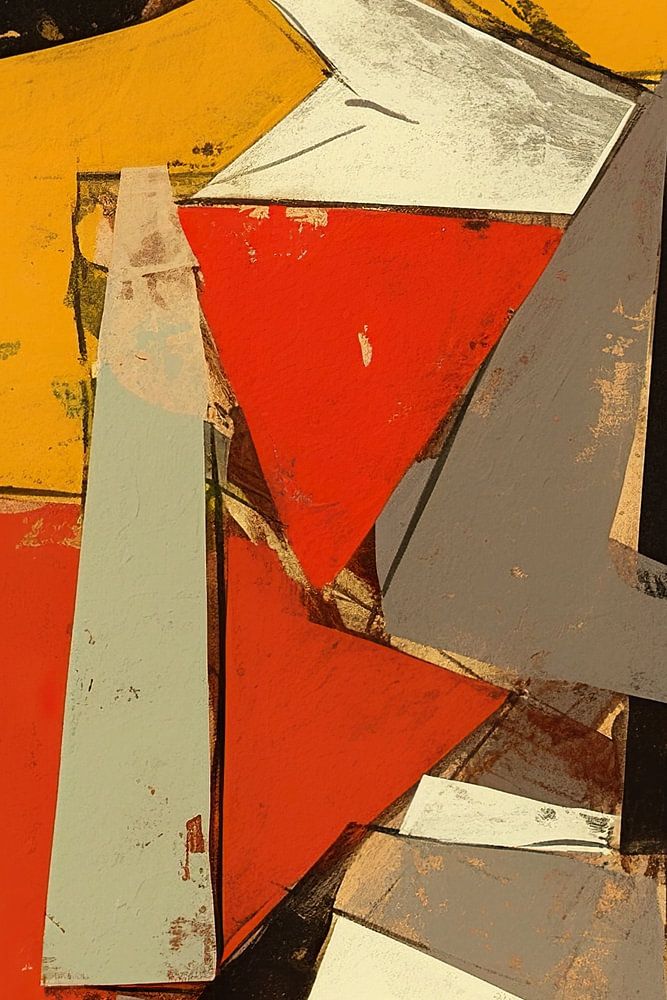 Details: abstract painting, woman painting, red dress, yellow background, modern art, geometric shapes, black, white, red, yellow