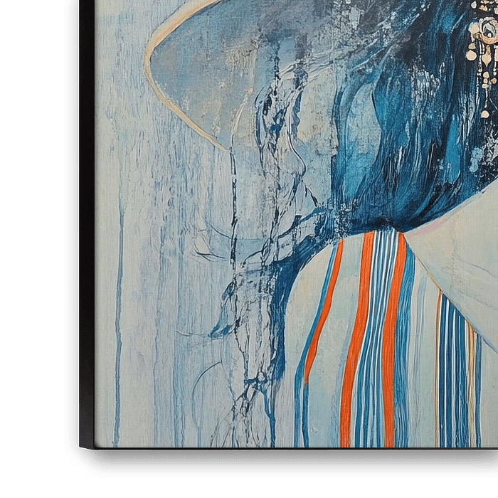 Woman with Hat - This woman painting shows a woman wearing a large hat full of flowers, her long blue hair falls elegantly along her face, and she has sparkling earrings and a necklace around her neck, giving a calm and dreamy look.