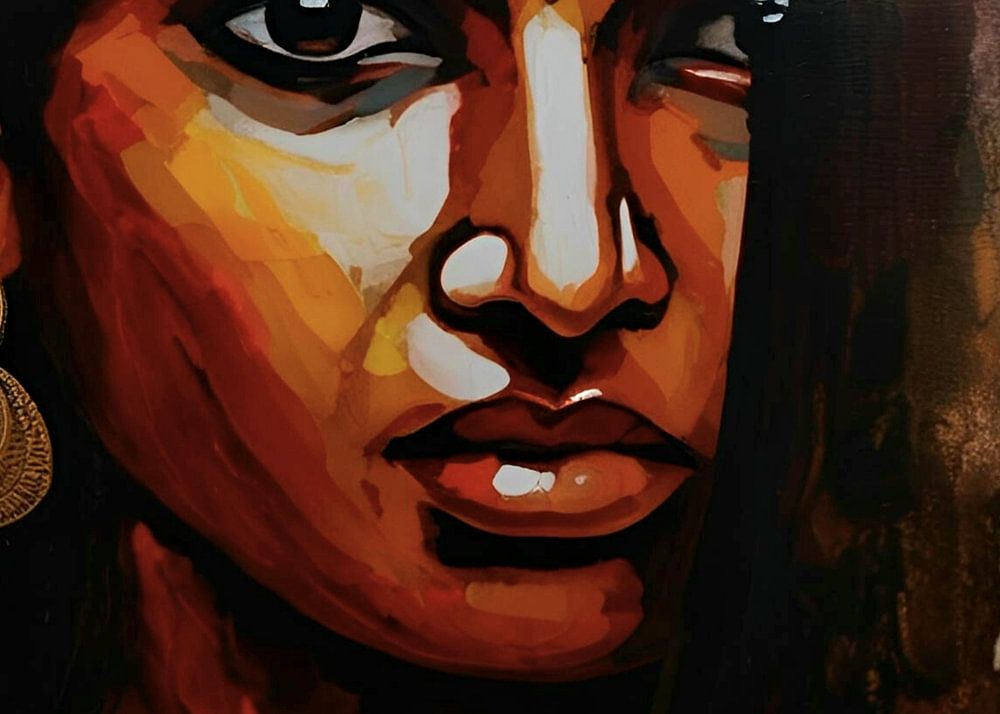 The painting features a close-up portrait of a woman with dark hair and a contemplative expression. Her face is painted in warm tones of red, orange, and yellow, with a hint of blue in her jewelry. She wears a gold headband adorned with a turquoise gem and large, ornate gold earrings. The background is a blurred abstract of warm colors, creating a sense of depth and mystery.
