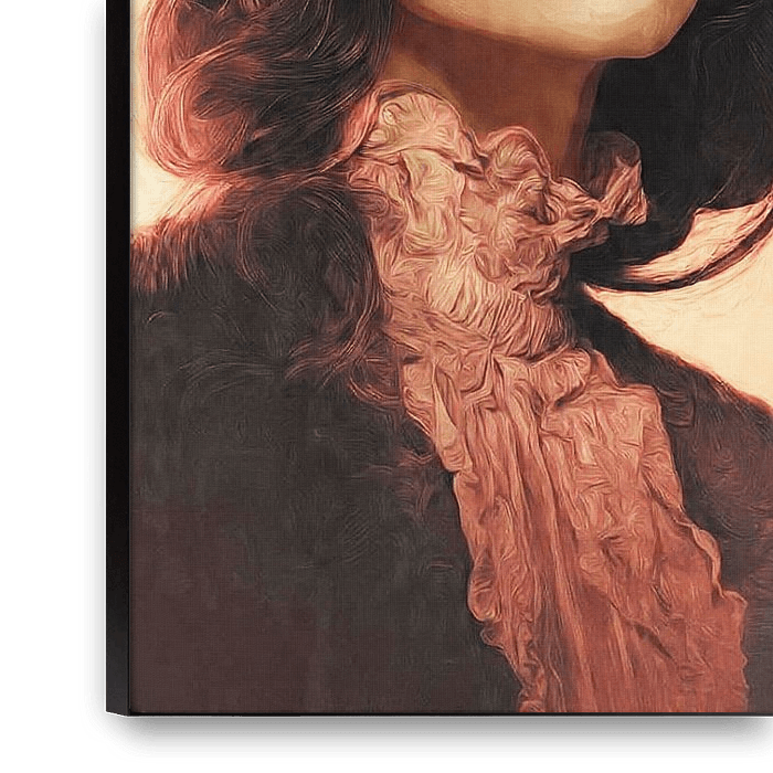 This artwork depicts a woman with long dark hair, dressed in a refined vintage blouse with a high collar and soft pleats. She wears large, elegant steampunk goggles in which warm, glowing light bulbs are visible. These bulbs seem to fill her gaze with light, inspiration and inner clarity. The background consists of a peach-orange hue…