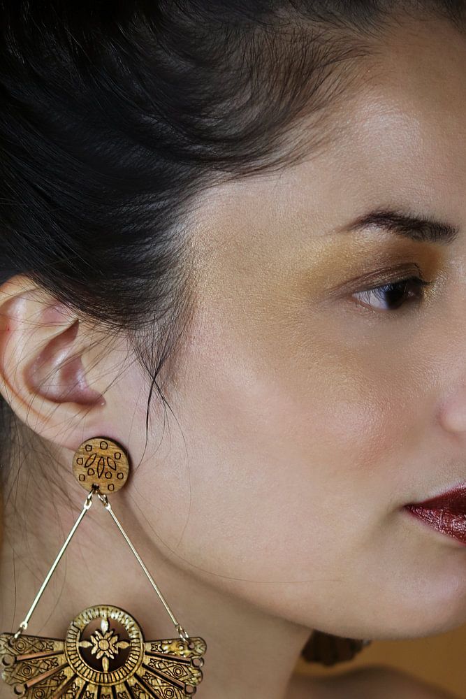 This portrait captures natural elegance and quiet strength. Set against a warm, earthy background, the woman’s features blend harmoniously with the tones of her wooden earring. The organic shape and texture of the jewelry highlight a deep connection to nature — pure, grounded, and authentic.