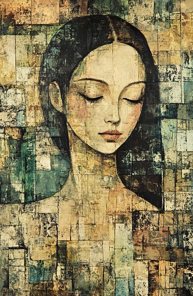 Woman with closed eyes - This is a painting of a woman, a painting of a calm woman with closed eyes and dark hair, executed as a modern, abstract portrait in mosaic-like surfaces with subdued earth tones and golden accents.