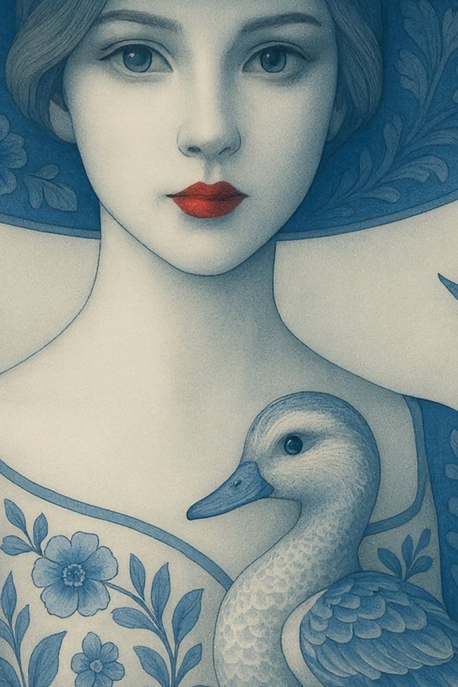 A delicate Delft blue portrait of a young woman wearing a hat, floral dress and holding a duck in her arms. The presence of the tulip, vase and dragonflies gives this artwork a dreamy and poetic atmosphere.