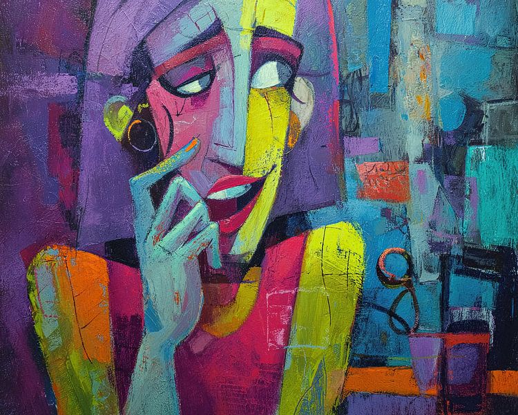 Details: woman, earring, colourful, abstract, emotion, face, cheerful, yellow, purple, blue Colours: purple, yellow, blue, green, orange, red Woman with…