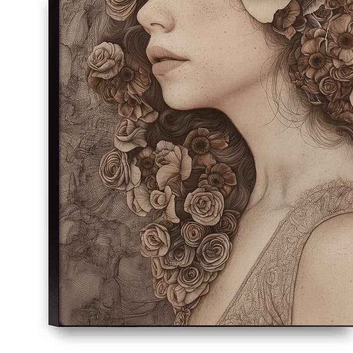 Buy this digital art artwork Woman with flowery hair by Bert Nijholt as a reproduction on canvas, ArtFrame, poster and wallpaper, printed on demand in high quality.