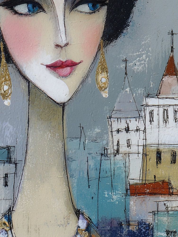 Woman with jewellery and city - This painting shows a woman wearing eye-catching earrings and a colourful necklace, while a city is visible in the background, giving the painting a modern look.