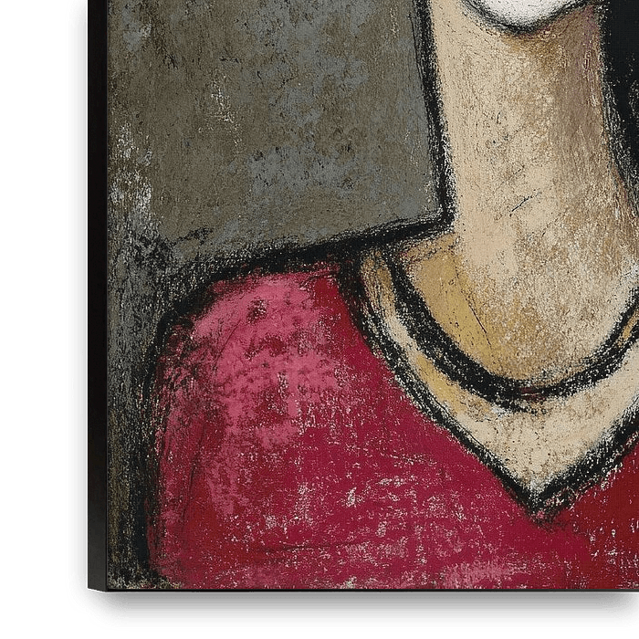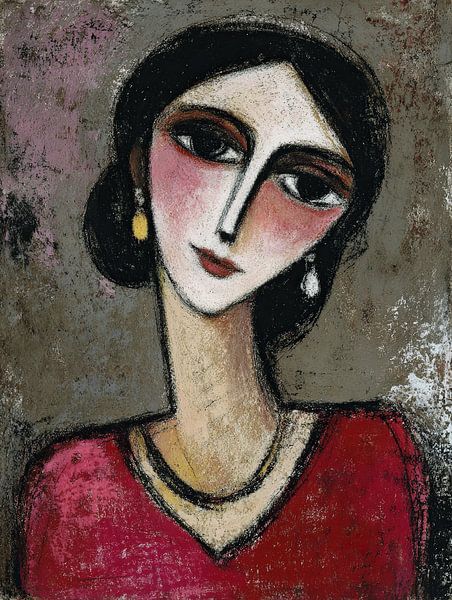 Details: women's painting, red dress, earring, art, modern art, face, large eyes, portrait, emotion, attractive Colours: red, black,…