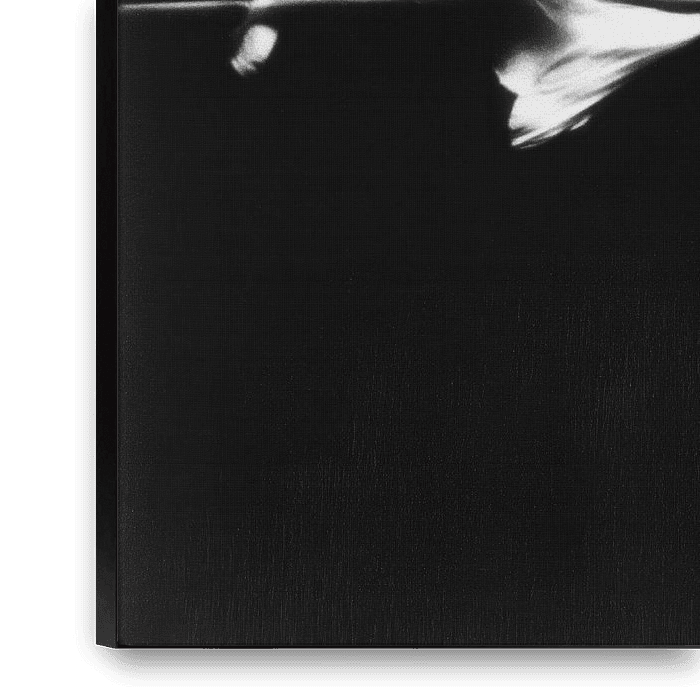 This black-and-white photo artwork shows a young woman with lilies, enveloped in a dreamy, almost surreal atmosphere. The photograph has soft, blurred contours, as if the edges of reality are blurring. The woman is central, her features delicate but partly hidden by a veil of light and shadow. Her skin radiates a soft glow, while her…