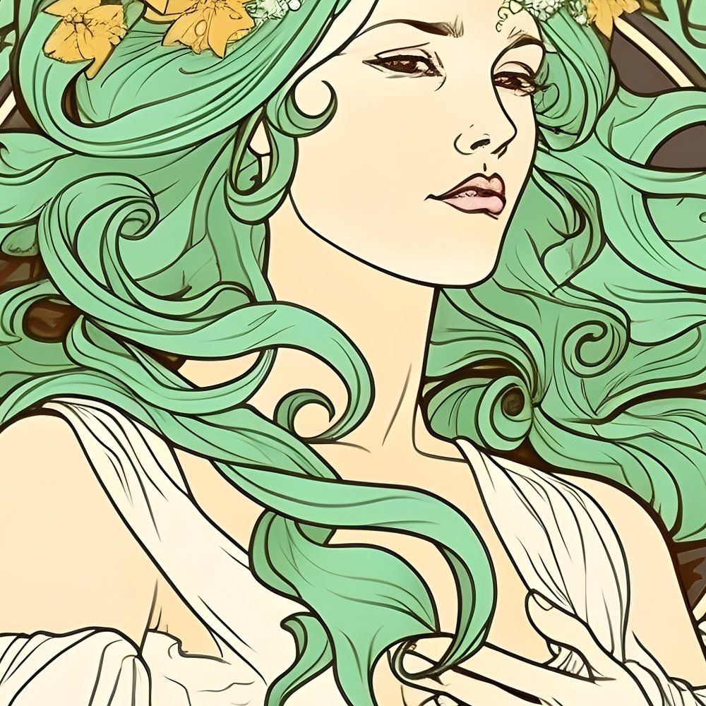 Woman with long green hair, Alphonse Mucha style by Jan Bechtum