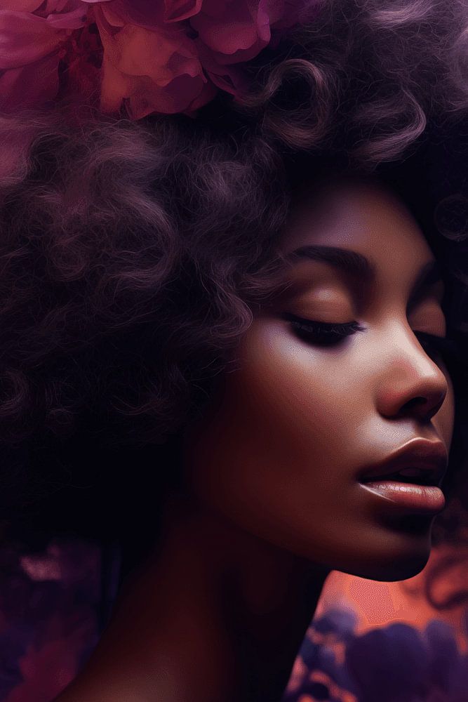 Portrait of a woman with a lush bunch of hair and purple flowers.