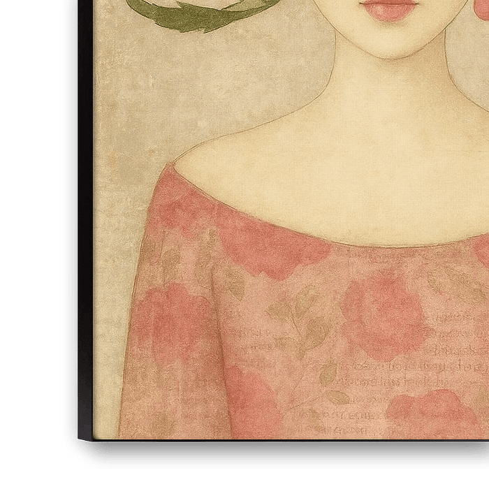 The woman does not wear a crown, but a rose - a symbol of love, growth and softness. Her gaze remains hidden, giving the image mystery and elegance. The warm pink and beige tones give this fine-art portrait a serene, timeless feel.