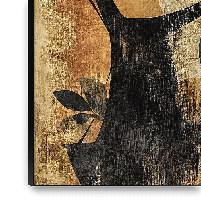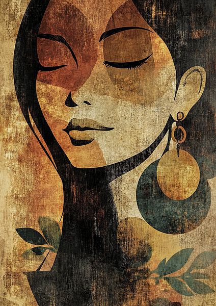 Details: woman, portrait, earring, abstract, modern, texture, leaves, brown, black, yellow Colours:…