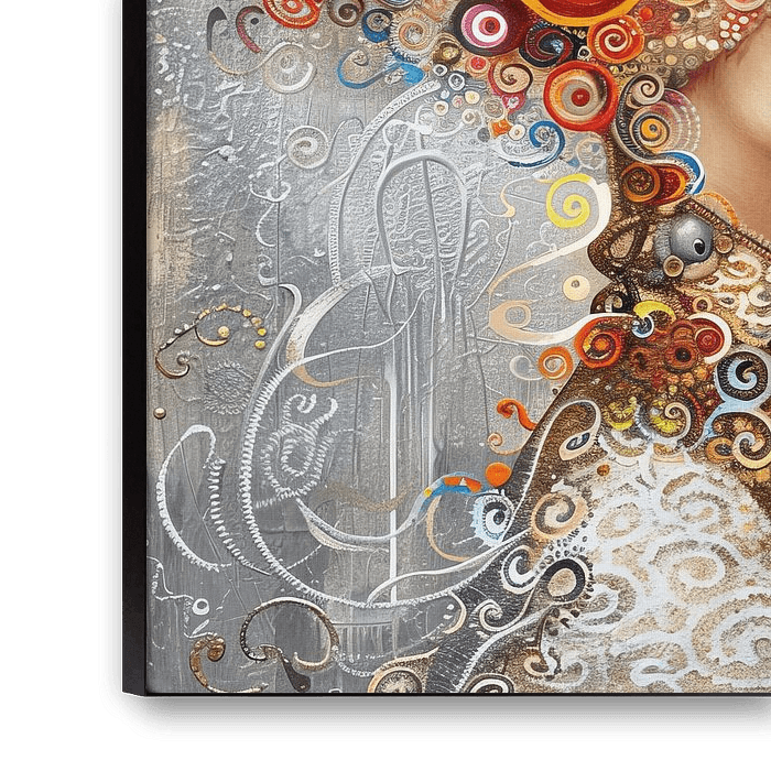 Women's Face | Mechanical Beauty Unwound - This women's painting shows a profile of a young woman with a flamboyant and colourful head of hair full of dynamic spirals and mechanical elements, accentuated by a collage of vibrant colours and patterns.
