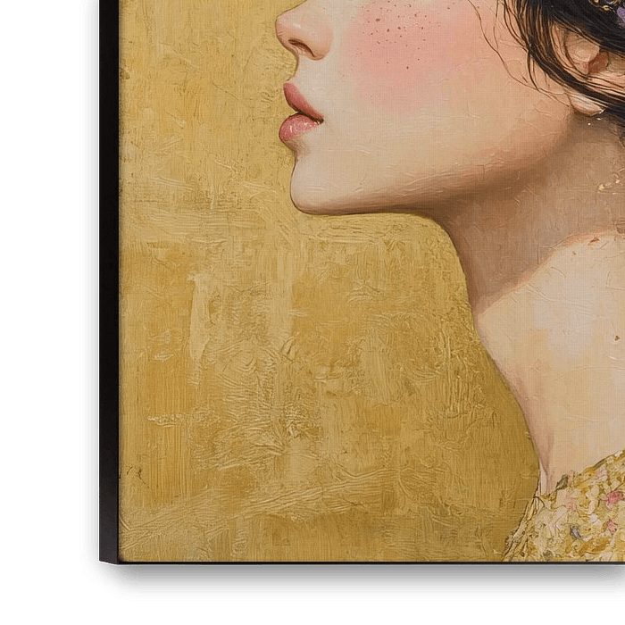 Details: women painting, flower painting, butterfly painting, modern art, gold background, side profile portrait, closed eyes, youthful look, flower crown, natural beauty