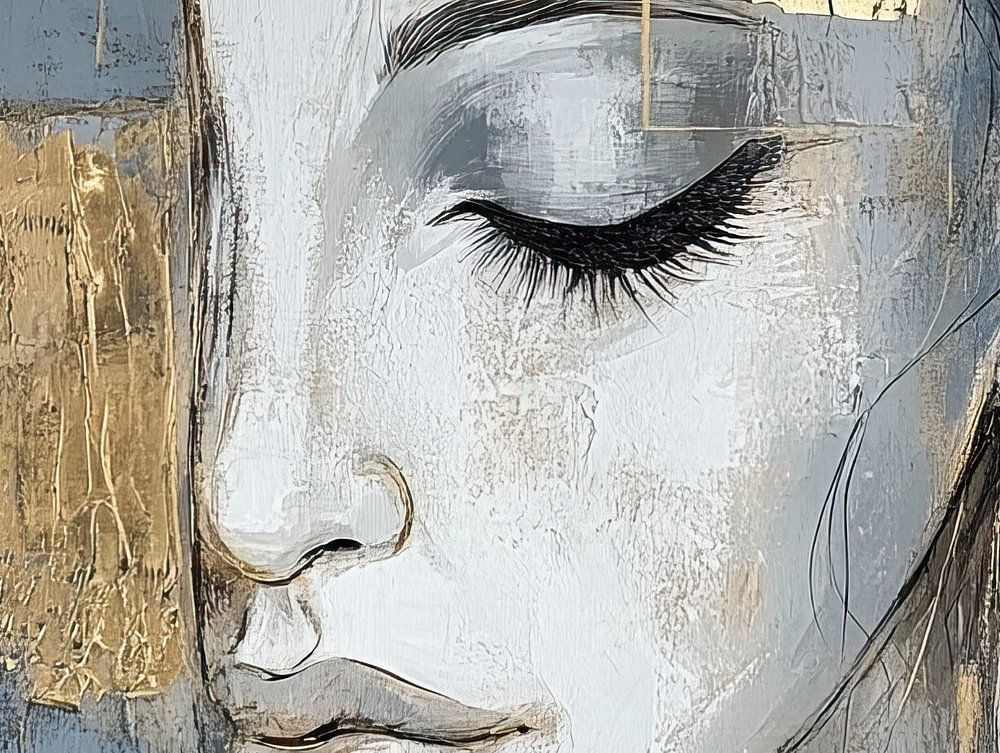 Women's Face | Golden Silence - This modern portrait painting shows the side of a woman's face with eyes closed, expressed in cool blue-grey tones and striking golden strips that break the canvas with a sense of abstract beauty.