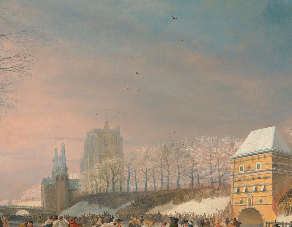 Skating competition for women on the Stadsgracht in Leeuwarden, 21 January 1809, Nicolaas Baur, 1809 In 1809, a hard-skating competition for women was held in Leeuwarden. In front of a packed audience, sixty-four unmarried women competed for the grand prize, a golden oorijzer. The winner was Houkje Gerrits Bouma. For more freedom of movement, the skaters had thrown off their cloaks. Baur painted the finalists with their bare arms, a cast-off cloak on the ice. The thinly veiled clothing caused a stir and therefore it was the last women's competition for the time being. Rijksmuseum Rights: CC0
