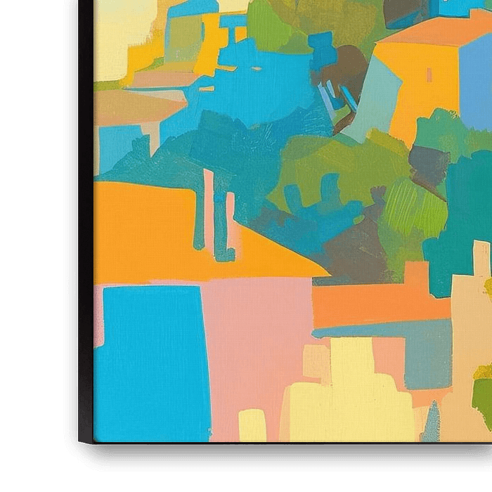 Women painting | Sunlit Serenity - This women painting shows a young lady wearing an elegant yellow hat, profiled against a colourful background of stylised Mediterranean houses and trees in vibrant pastel colours.