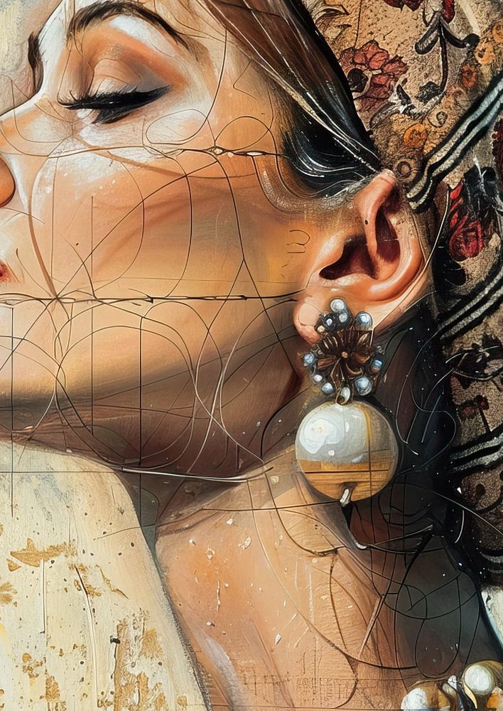 Details: woman, portrait, painting, elegance, headscarf, serene, documents, abstract, texture, golden