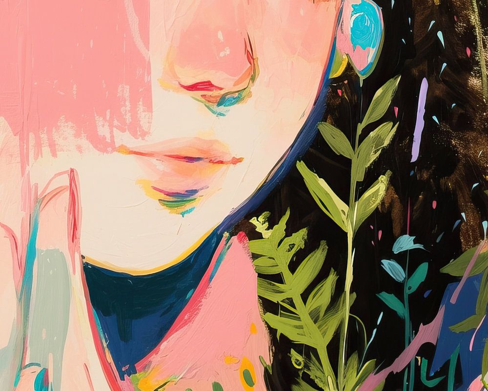 Women's Portrait | Colors of Her Soul - This portrait painting shows a young woman whose face is softly rendered with expressive, bright colour strips and floral elements, evoking an intimate and dreamlike atmosphere.