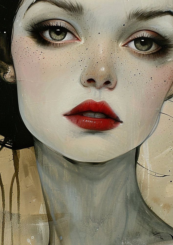 Female portrait | Gaze Ablaze - This female painting shows a serene portrait of a young woman with large emotional eyes and red lips, against a background of abstract elements and splashes in neutral and earthy tones.