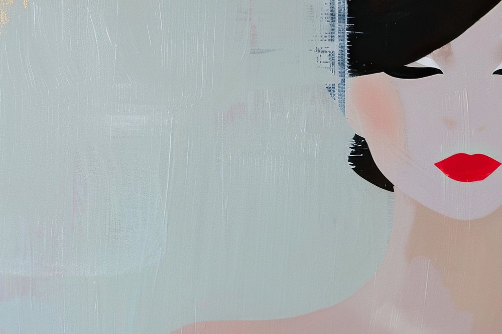 Details: woman, portrait, abstract, text, pastel, black hair, red lips, modern, art, style