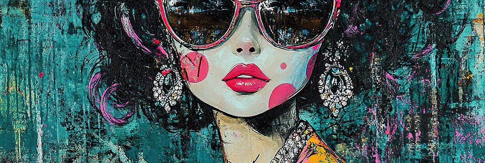 Women's Portrait | Urban Chic - This women's painting shows a stylish, young woman wearing large sunglasses and decorated with vibrant, graffiti-like backgrounds in a mix of street art and portraiture.
