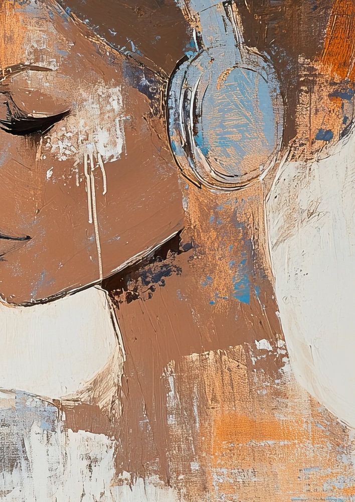 Female portrait - This female portrait painting shows a serene woman with closed eyes and headphones, depicted in an expressionist style with rough, textural, rusty brown and white paint strokes.