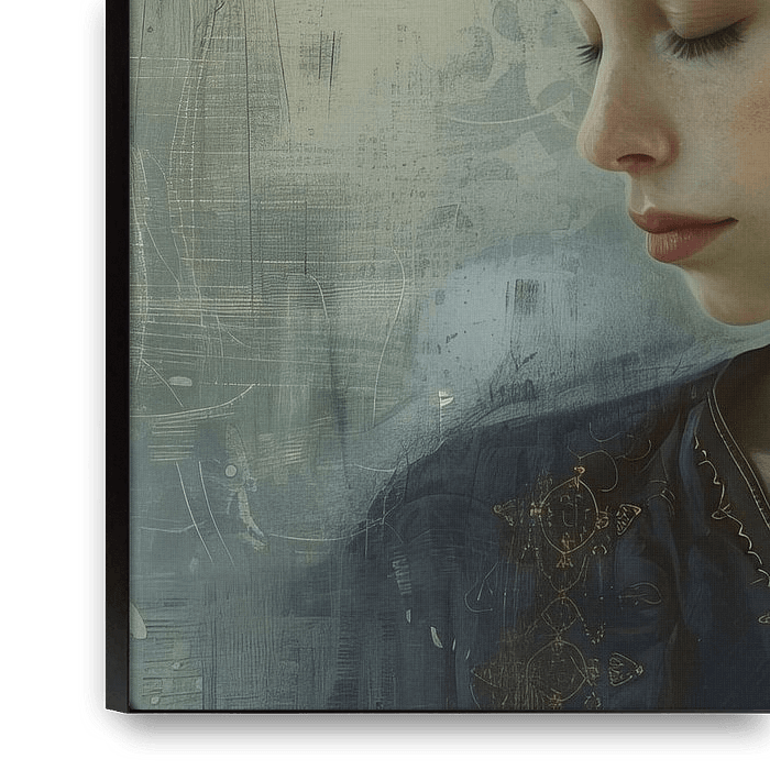 Women - This women's painting shows a young woman with a serene and contemplative expression. Her face is soft and detailed with a subtle pink blush on her cheeks and a peaceful gaze directed downwards. Her dark brown hair is put up in an elegant bun, a few loose locks adorn her face. The woman's clothing is dark blue with delicate gold…