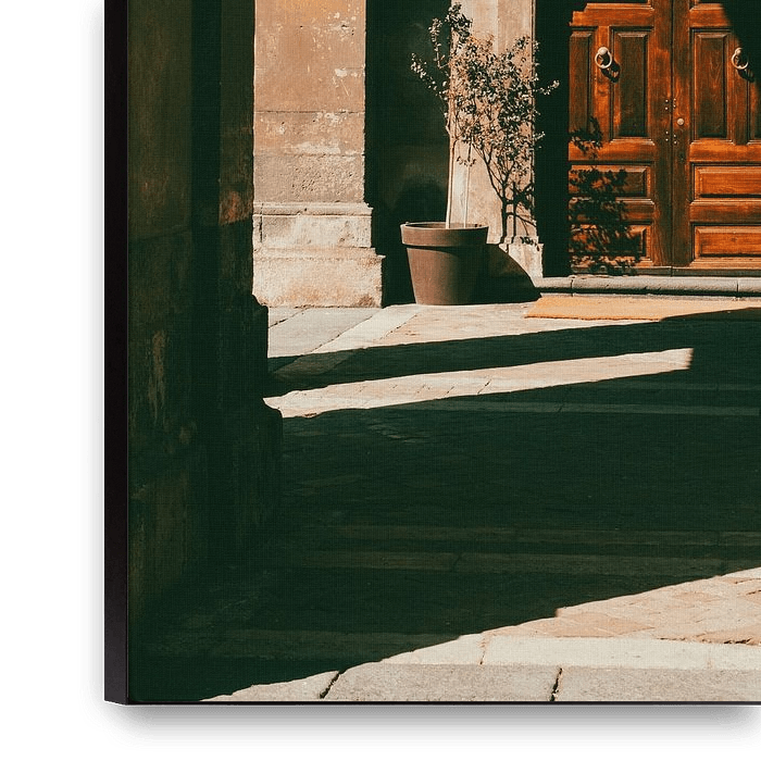 This image shows a beautifully carved wooden door illuminated by sunlight, located in a quiet, shady alley in Catania, Italy. The light creates a striking contrast, highlighting the warm tones of the wood against the cool, dark surroundings. Potted plants on either side of the entrance add a touch of life to the serene and slightly…