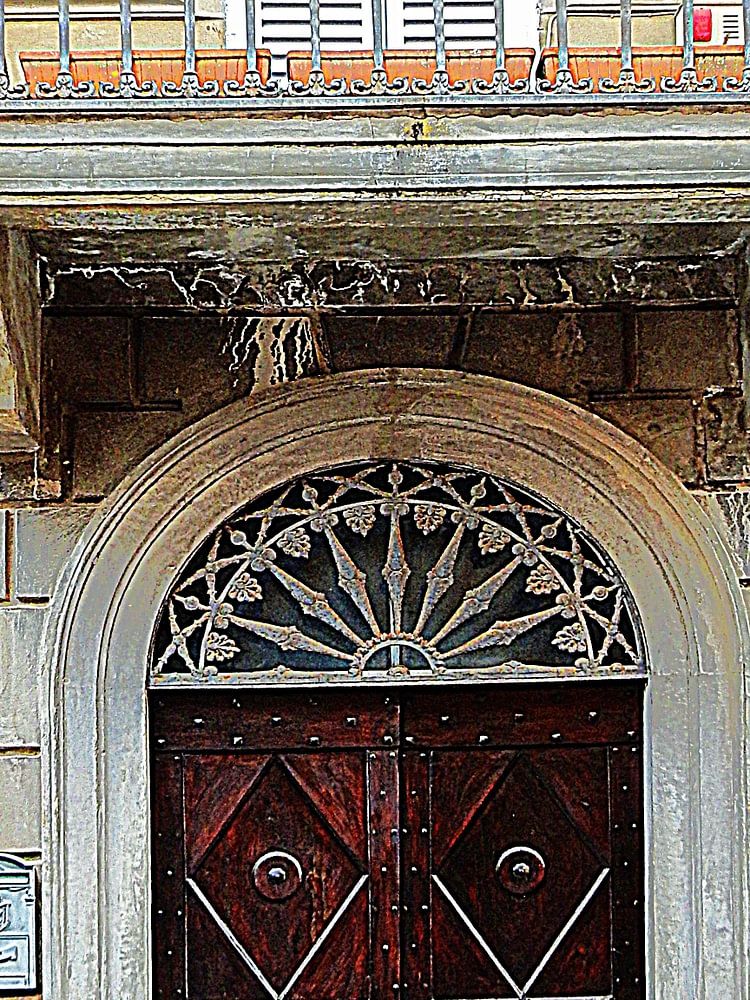 A traditional Italian doorway with a carved wooden door and ornate door furniture and embellishments. There is a metal window grill above to allow light into the space beyond. Immediately above the door is a balcony with metal railings accessed via a double door with white shutters.