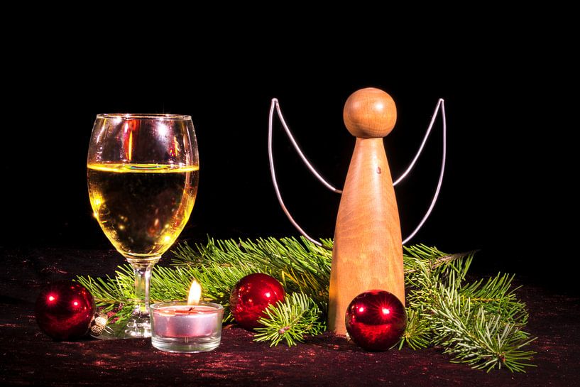 Christmas, wine, glass, angel, wooden figure, Christmas tree balls, fir branch, candle, tea light, red, green, brown, black, cozy, quiet, festive, needles, candlelight, Advent, religion, Christianity, decoration,