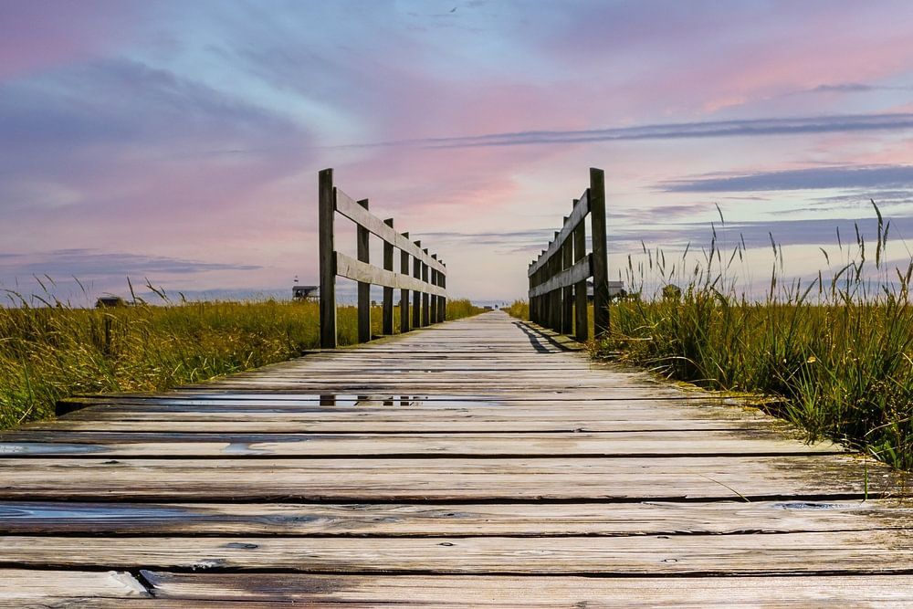 Wooden bridge in the salt marshes on the North Sea at sunset