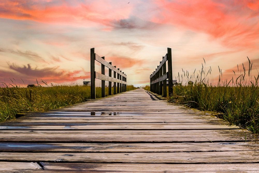Wooden bridge in the salt marshes on the North Sea at sunset