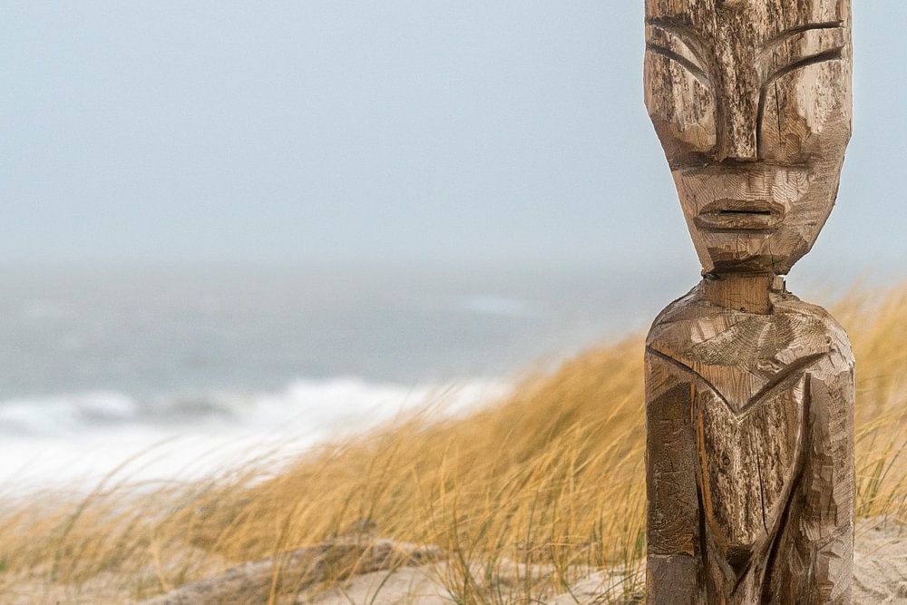 A small wooden work of art stands on the beach on the island of Sylt in Germany. With the North Sea in the background and the dune landscape, it is a perfect image for a wall embellishment.