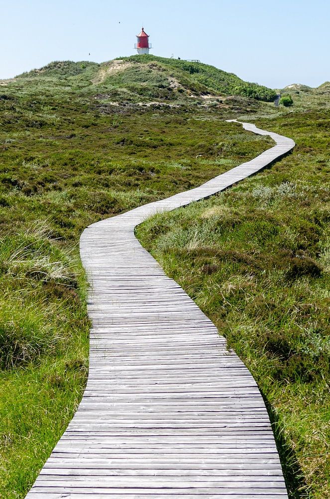 The composition is horizontally orientated and uses the perspective of the path to create depth and direction. There are no people or additional objects in the picture, so the focus is entirely on the landscape, architecture and pathway. The shot is suitable for subject areas such as coastal landscape, nature photography, maritime orientation, tourism, navigation, architecture, outdoor activities and visual structure. It can be used in digital media, exhibitions or as a decorative element in living and working spaces.