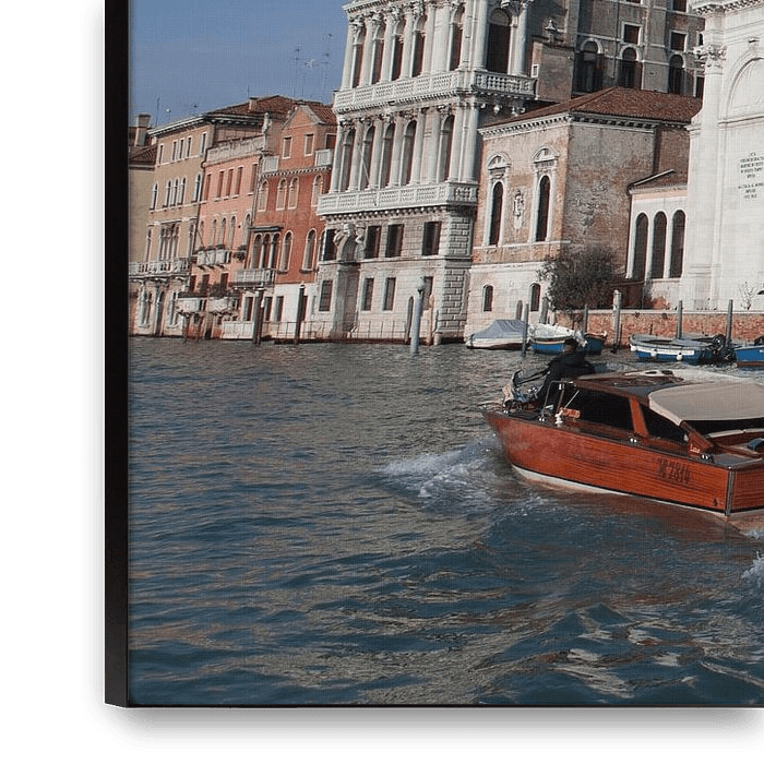 Old speedboat on canal in old town of Venice, Italy