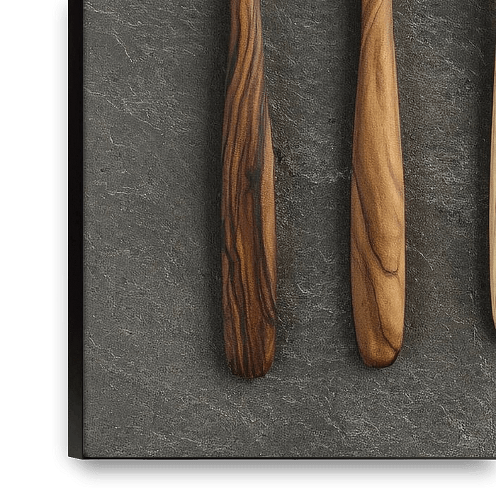 This beautiful picture shows a collection of wooden spoons filled with various spices and herbs, beautifully arranged on a dark background. The minimalist design and warm wood tones create a soothing look, ideal for lovers of culinary art and interior decoration. This picture would look great in a kitchen or dining room and can serve as…