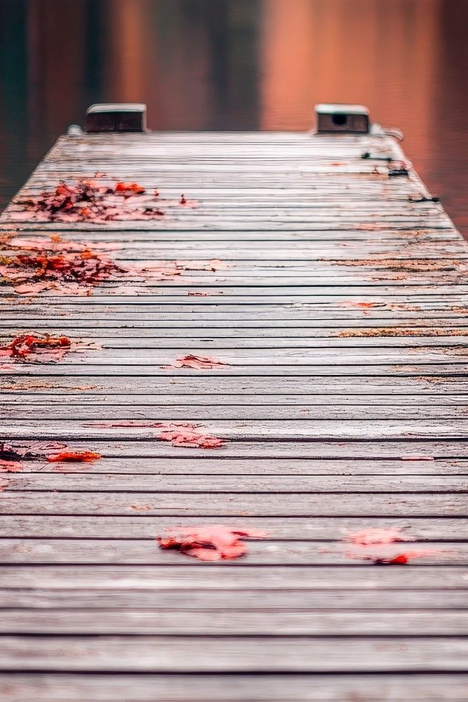 A picturesque footbridge stretches gently over the smooth surface of the water, surrounded by bright autumn colours. The tranquil atmosphere and the scattered leaves invite dreamy thoughts. Perfectly hung in a living room, this picture creates a harmonious connection to nature and makes the room appear colourful and inviting.