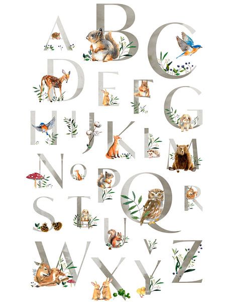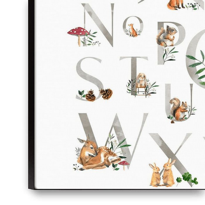A charming illustrated alphabet filled with adorable forest animals and soft natural details.