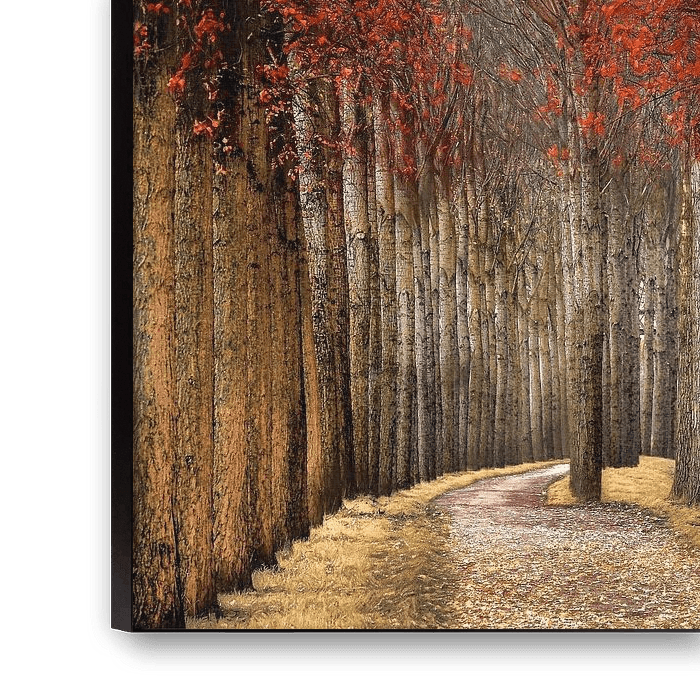 Mysterious and dreamy walkway with row of trees with red foliage.